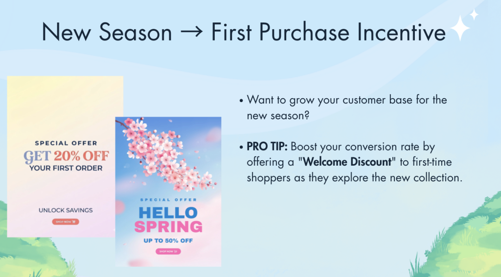 - First-Purchase Incentives: Boost conversion rates by offering “Welcome Discounts” to new shoppers exploring the spring line.